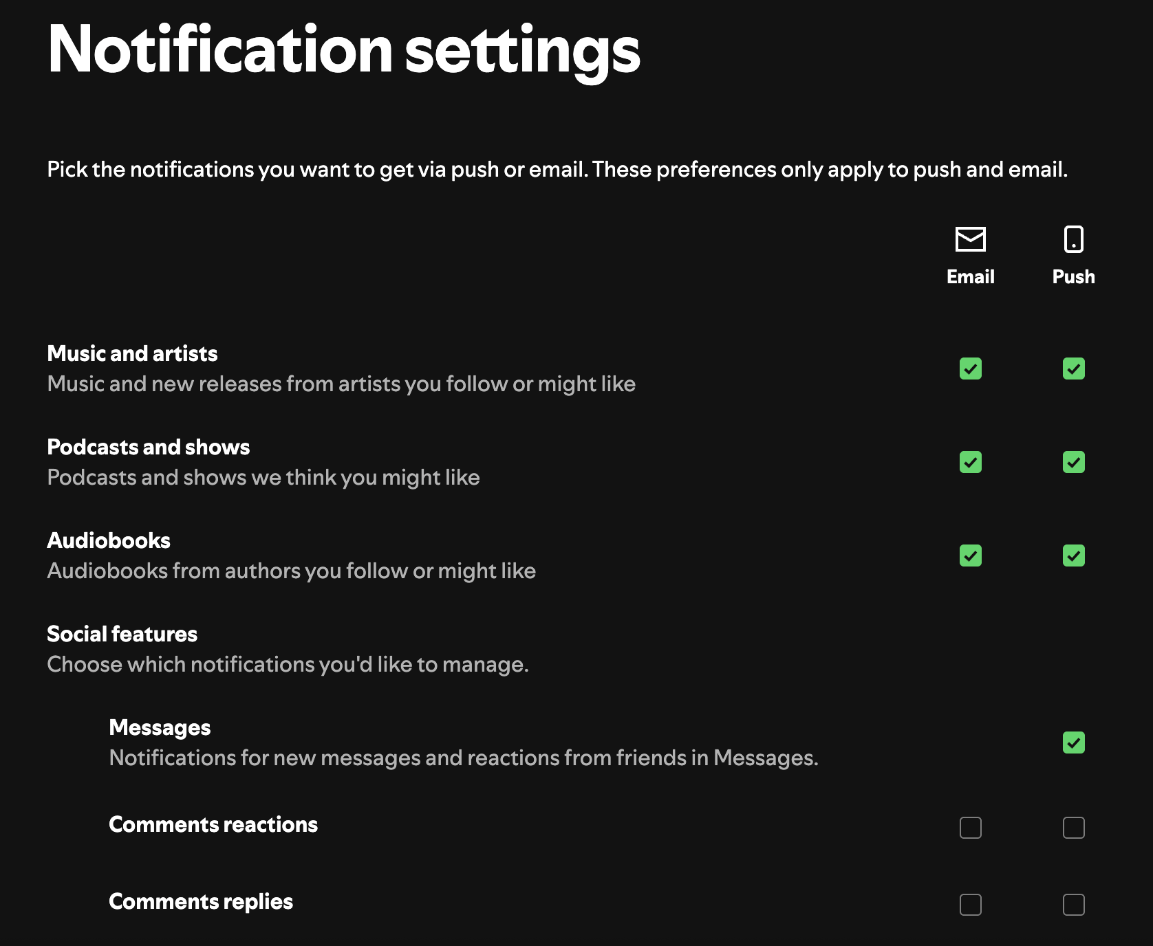 Case in point: Spotify knows users consume all different kinds of content on their platform, from music to audiobooks to podcasts—so not everyone will be interested in the same things. Their preference center enables listeners to select which categories they’d like to receive notifications about, as well as options for receiving or muting notifications about messages, comment reactions, and comment replies. Users can also select how to receive notifications, whether via email or mobile push notifications.