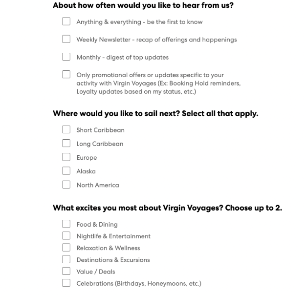 For example, Virgin Voyages collects subscriber data to learn about which cruise destinations they’re interested in, what they value most in a cruise journey, and how often they’d like to receive messages. The brand then uses this data to deliver highly personalized email and SMS campaigns that cater to each subscriber’s unique interests and preferences.