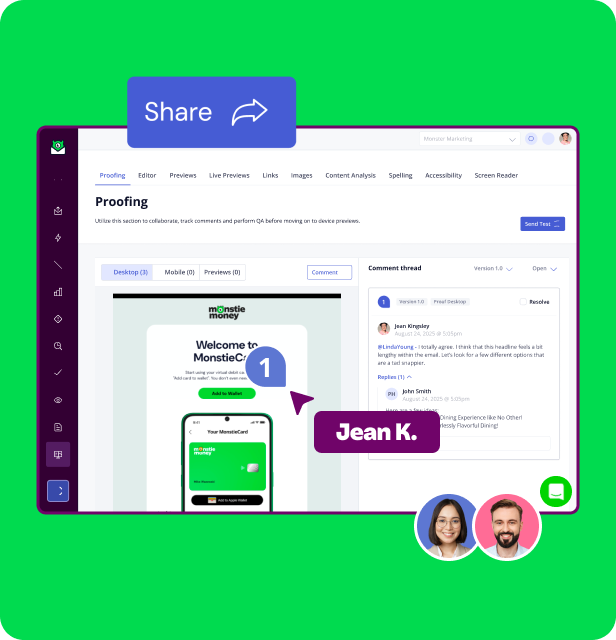 Inbox Monster’s Creative Suite streamlines your entire pre-send workflow. Collaborate with your team in real time, test interactive content and render across 110+ modern clients and devices.